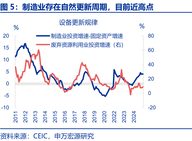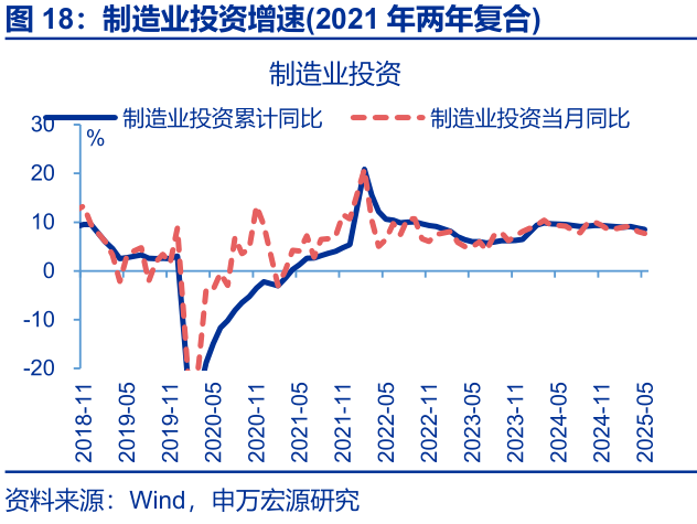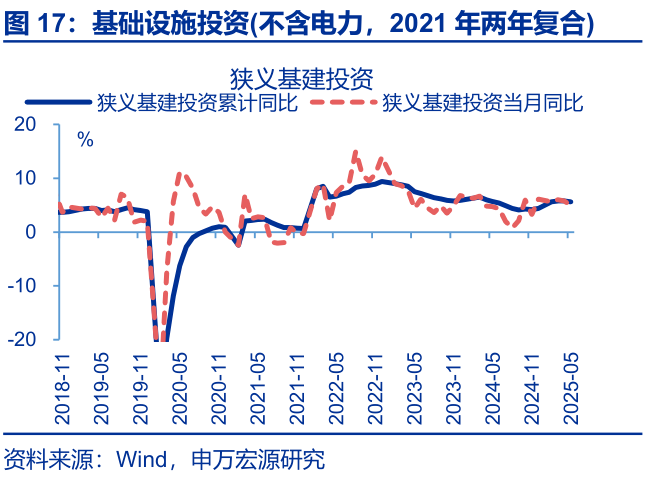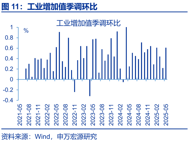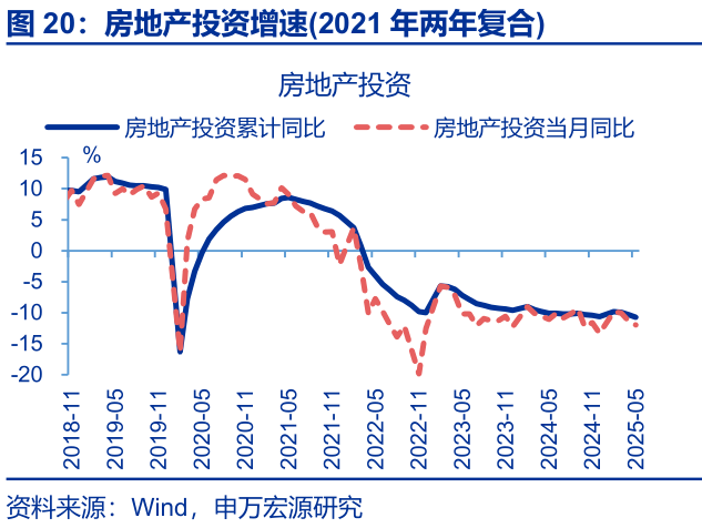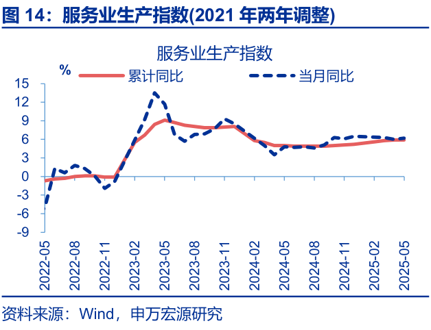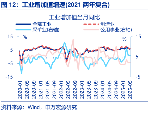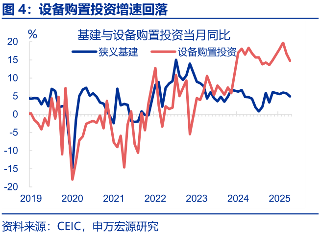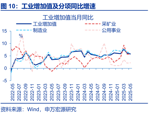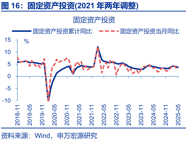 5月固定资产投资明显走弱,主因设备更新退坡、地产与传统基建回落,但服务业投资仍在提速。5月固定投资累计同比3.7%,当月同比回落0.7pct至2.8%,剔除价格后实际增速回落0.6pct至3.7%;分结构看,投资走弱主要源于设备更新周期接近结束。我们此前领先指标提示,设备自然更新周期的尾声在二季度,5月设备购置(-1.9pct至14.8%)与制造业投资增速(-0.4pct至7.7%)均继续回落;广义基建投资增速虽然持平于9.8%,但结构上传统基建回落明显(-0.9pct至1.8%)。虽然交通运输业投资仍在回升(+0.2pct至4.3%),但水利环境公共设施管理业投资走弱(-2.4pct至3.7%);公用事业低基数下增速也小幅回升(+0.9pct至25.1%);服务业投资明显提速(+1.9pct至4.5%),今年民间投资从制造业向服务业转换,企业家信心修复与服务消费类财政支出加快,对服务业投资形成直接支撑。
