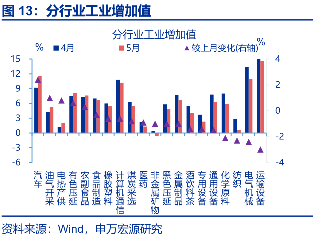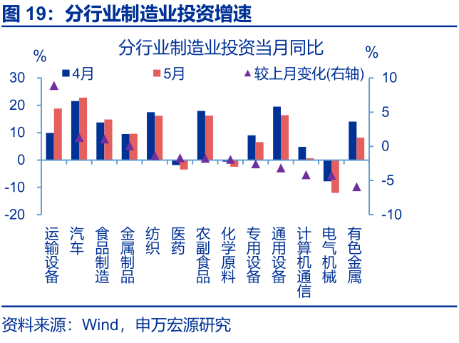 生产:制造业生产回落主因工作日减少,以及地产基建与出口走弱。5月工业内部,采矿业持平前月、公用事业小幅回升,但劳动密集型行业占比较高的制造业(-0.4pct至6.2%)降幅较大,后者受到5月工作日比去年同期少2天的影响。制造业内部,传统基建与地产投资下行,拖累黑色金属、非金属矿物生产走弱;出口下滑拖累运输设备、电气机械、纺织生产走弱。但消费改善拉动下游汽车等行业生产回升。