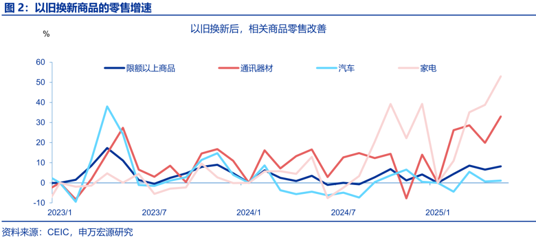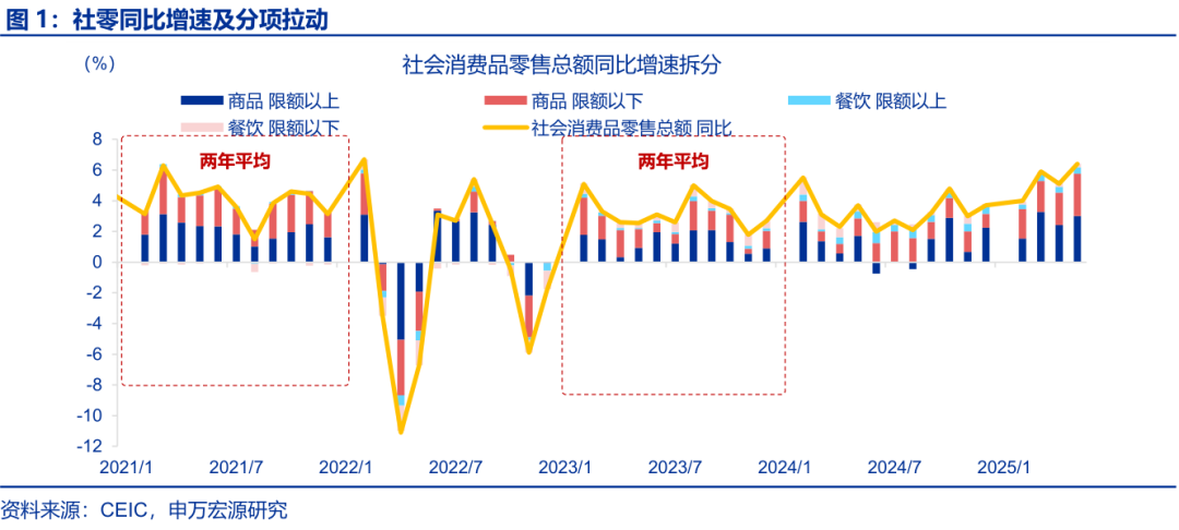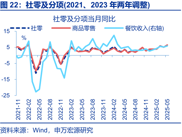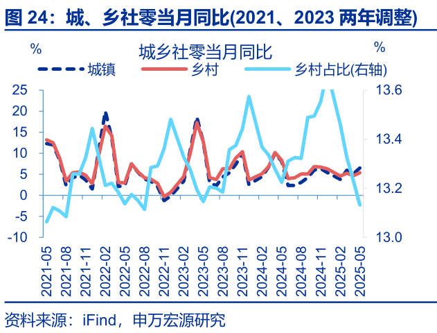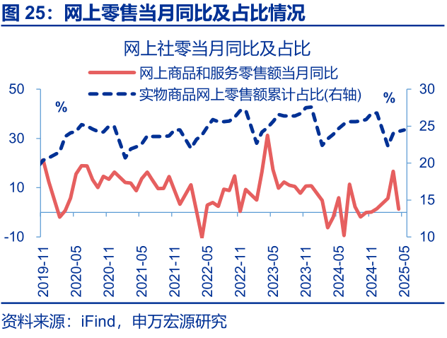 社零:增速明显超预期,源于电商促销前置与假期增加(同比去年多2天)带动出行需求释放。5月社零同比增长6.4%,较前值提升达1.3个百分点,创2024年以来新高。社零改善主要源于商品零售,其中限额以上商品零售中改善主要源于家电(+14.2pct至53.0%)和通讯器材(+13.1pct至33.0%),和电商促销前置以及部分商品降价有关。另外,汽车零售(+0.4pct至1.1%)有小幅改善。必需品相对稳定,主要贡献来源于烟酒(+7.2pct至11.2%),粮油食品(+0.6pct至14.6%)。限额以下商品零售(+1.3pct至13%)和餐饮收入(+0.7pct至5.9%)双双改善,源于5月假期比去年多2天(4月假期与去年同期持平),带动居民出行需求集中释放。与服务消费更相关的服务业零售额也在改善(累计同比+0.1pct至5.2%)。