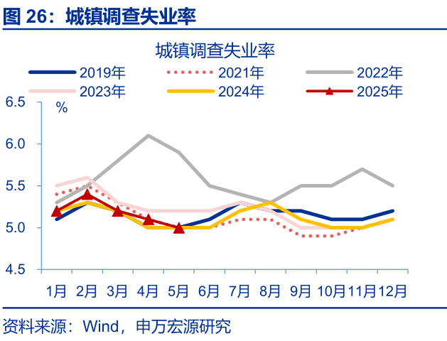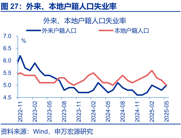 就业:城镇调查失业率有所回落,本地户籍人口就业压力有所好转。5月,城镇调查失业率回落0.1个百分点至5%,低于过往5年均值0.3个百分点。其中,本地户籍(5.0%)人口失业率较前月回落0.2pct,外来户籍(5%)较前月回升0.2pct。