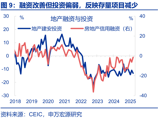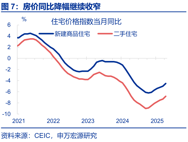 地产供给端问题仍在改善,需求端进入刚需集中释放后的退坡期。供给端,在住建部提出“严控住宅增量”之后,地产企业过度竣工未售现房、累高现房库存的现象明显好转。5月住宅竣工同比降幅仍大(-22.1%),推动房价边际企稳。70城新房、二手房价格同比分别回升0.4、0.5pct至-4.1%、-6.3%;需求端,地产建安投资表现近两年来持续弱于信用融资增速,反映存量项目减少以及严控新增项目的影响,地产投资增速回落0.7pct至-12%,商品房销售面积回落1.2pct至-3.3%。反映前期积压刚需集中释放后、进入“退坡期”,但在房价同比回升过程中,销售额回升0.7pct至-6%,新开工增速也小幅改善(+2.9pct至-19.3%)。