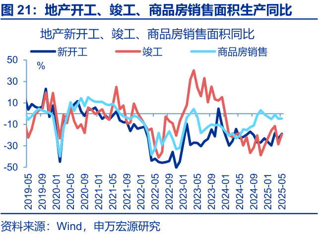 地产投资亦有走弱,地产开工、竣工、商品房销售面积仍在历史低位。5月,房地产开发投资延续回落,累计同比较前月下行0.4pct至-10.7%,当月同比较前月下滑0.7pct至-12%。分不同阶段看,新开工、商品房、竣工面积均在历史相对低位,当月同比分别较前月回升4.7、9.4、0.1个百分点至-18.7%、-19.1%、-4.6%。