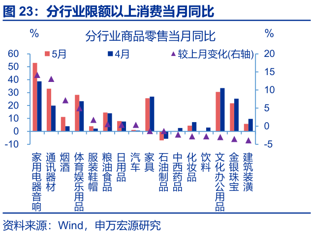 消费:社零增速有所上行,结构上商品零售涨幅较大。5月,社零当月同比较上月回升1.3pct至6.4%。其中,商品零售、餐饮收入当月同比分别较上月回升1.4、0.7pct至6.5%、5.9%。分品类看,家用电器音响、通讯器材涨幅较大,当月同比分别上行14.2、13.1pct至53%、33%;汽车零售增速亦有改善,当月同比上行0.4pct至1.1%。